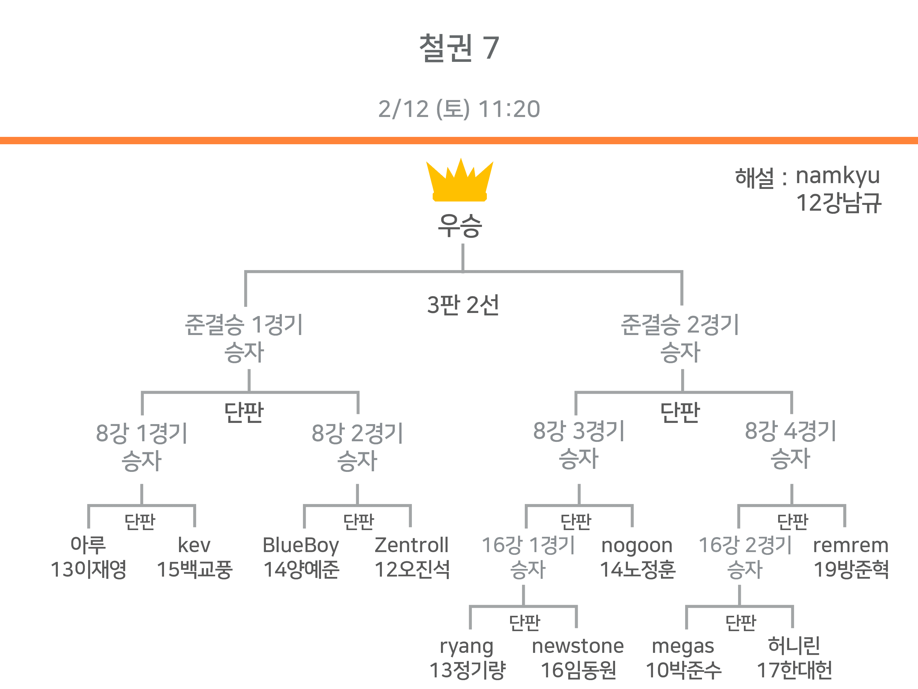 - 8강까지는 단판, 4강 이상은 3판 2선제로 진행됩니다.